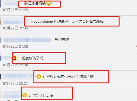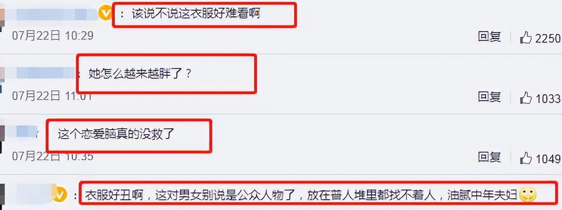 也有的忍不住调侃衣服好难看,她怎么越来越胖了,这个恋爱脑真是没救了,还是公众人物,放普通人堆里都找不到人,油腻中年夫妇。真怕她被渣男骗,难道美女眼光都有问题?