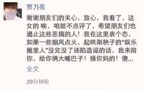 随后,自己的老婆被污蔑作为老公的贾乃亮也开始按耐不住了,在朋友圈上大发雷霆的发表的一条帖子,力证自己老婆的清白,并不惜爆出口指责诬陷造谣者。