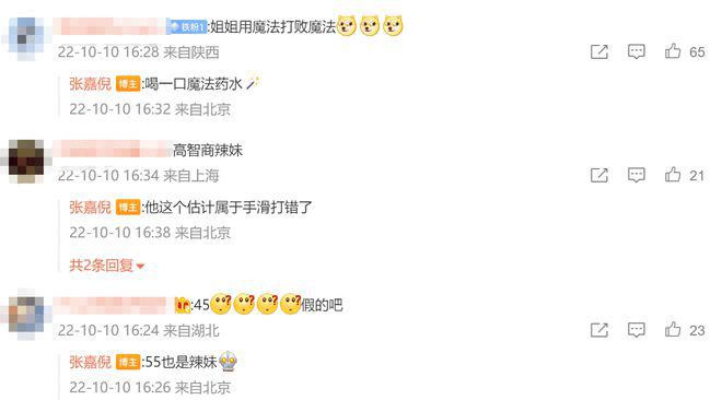 网友也调侃道:" 姐姐用魔法打败魔法 "," 高智商辣妹 ",还有人表示:"45?假的吧," 张嘉倪则幽默回应:"55 也是辣妹。"