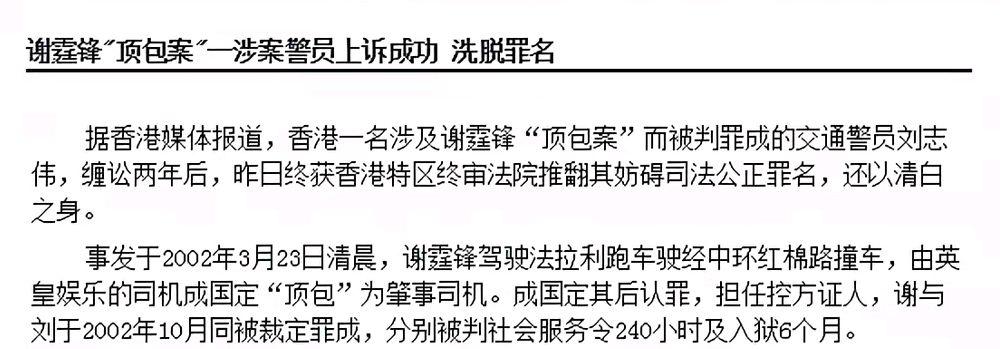 2002年3月23日,谢霆锋开车出了交通事故,为了摆脱责任,谢霆锋找人给自己顶包,谓之“顶包案”。
