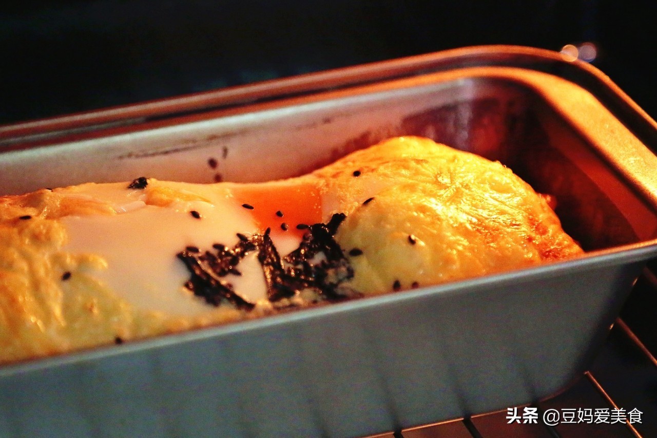 豆妈的这个方子用两个鸡蛋就够了,一个打散用来调和面糊,还有一个就直接打在面糊上,进烤箱烤,这就是这款鸡蛋糕的特色之处。烤的时间长,鸡蛋更凝固,如果想吃溏心蛋就要记得缩减时间,十二分钟左右就够了。