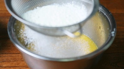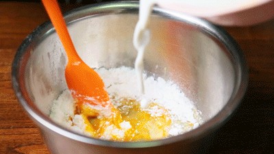 2. 筛入面粉和泡打粉,混合均匀,不要过度搅拌,以免起筋。
