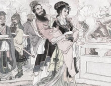 周幽王和褒姒 [20]前779年),伐六济之戎失败;同时天灾频仍,周朝统治内外交困。幽王,宠爱褒姒,幽王废掉正后申侯之女及太子宜臼,改立嬖宠美人褒姒为后,其子伯服(一作伯盘)为太子。宜臼逃奔申国,宜臼的母亲是申侯的女儿。申侯联合缯国和西方的犬戎进攻幽王。杀幽王于骊山之下,犬戎乘机掠走大量财宝。西周就此灭亡。宜臼靠诸侯的帮助,登上王位,是为平王,翌年迁都洛邑,从此,历史进入东周时期。前771年,西周覆亡。 [15]