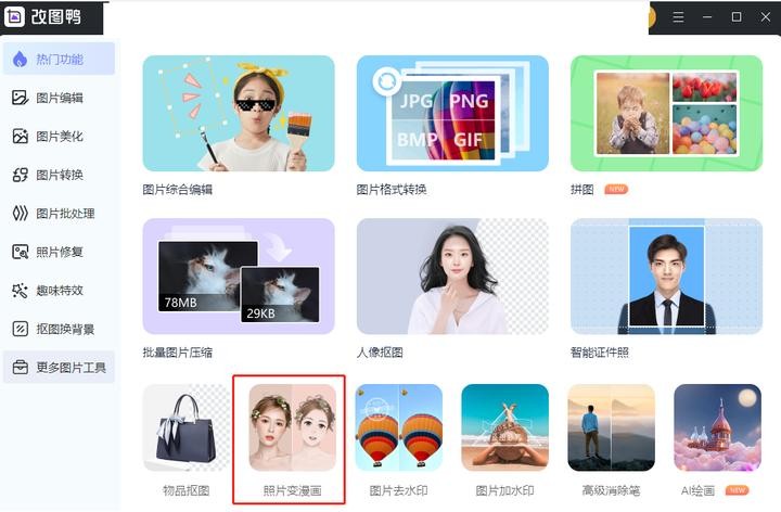 点击进入界面之后,我们在界面点击【照片变漫画】即可开始我们的图片变换之旅喽~