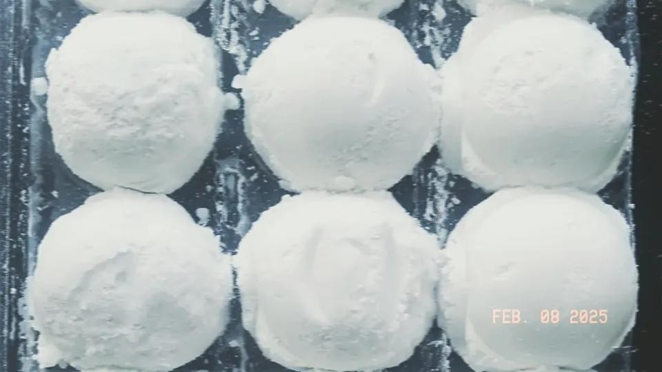 3.裹粉摇制,将蘸水后的馅料放入装有糯米粉的大盆中,快速摇晃。大盆让馅料在糯米粉里滚动均匀,裹上一层粉摇的时候,动作要轻快,幅度适中,保证每个圆球都能裹到粉。