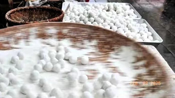 4.再次蘸水裹粉,把裹好一层粉的元宵胚,用笊篱捞出再放入清水中,快速蘸一下,然后放回原有糯米粉的盆里,继续摇晃裹粉。如此反复4至5次,每次裹粉前都要蘸水。直到元宵达到合适的大小,一般直径在3至4厘米左右。