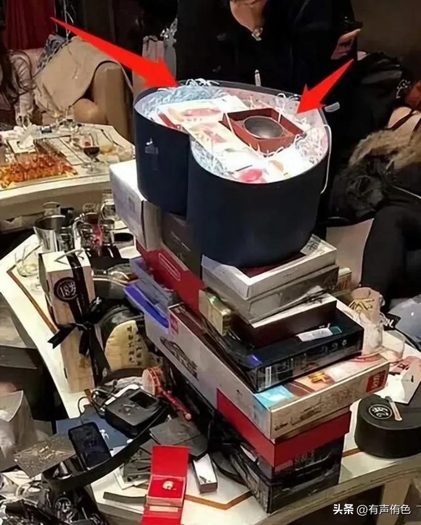看看吧,这张照片上有堆积如山的奢饰品,叠在最高处打开盖子的是个装满28万人民币的心形纸盒,厚厚的人民币中间,还放了一个纯金杯子。