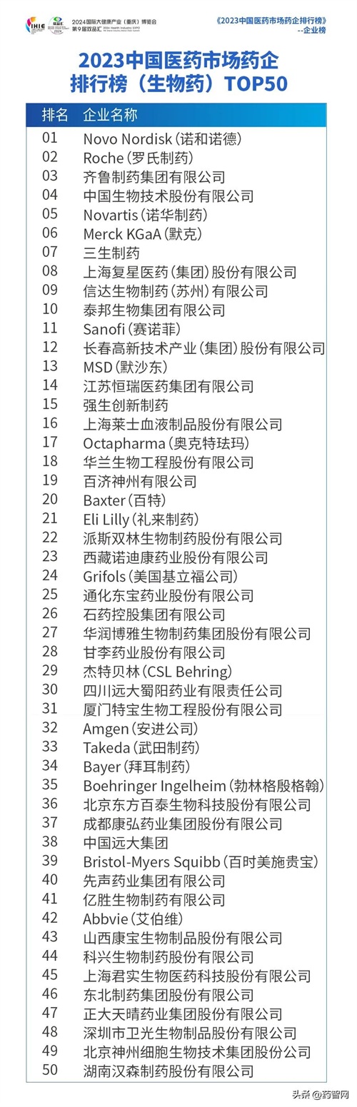生物药榜前三甲分别为诺和诺德、罗氏制药、齐鲁制药。