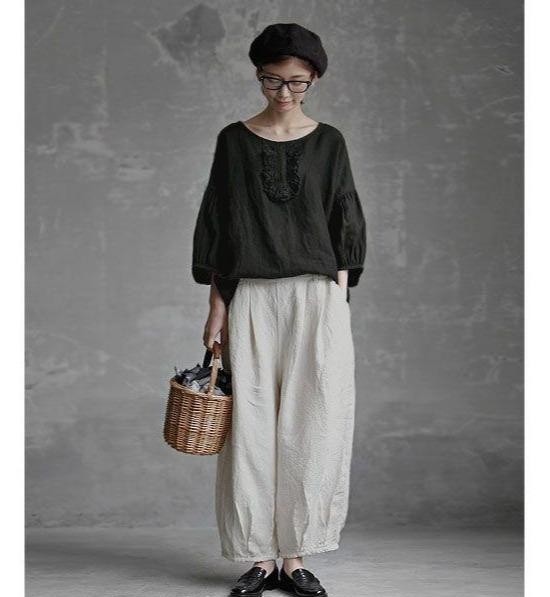 森系风格的近邻就是复古风,所以这样的造型也被大家称之为最早期的复古穿搭。黑色的宽松上衣能衬得我们越发娇小,下身就要配一条米白色的阔腿裤,脚踩一双平底鞋就可以增加更多的散漫和随性气息,黑色的贝雷帽带来更多的活力感。