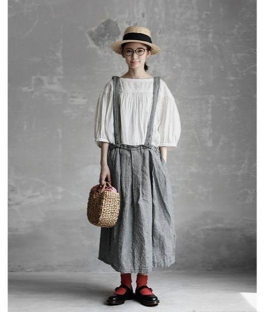 这种风格的裙子一般都是长及膝盖的,所以可以很好的遮肉显瘦。白色的宽松上衣可以让我们拥有满满的青春气息,外面的一条浅灰色的背带裙就可以轻松给炎热的夏天带来自然的清爽感,一双复古老皮鞋更是显气质。
