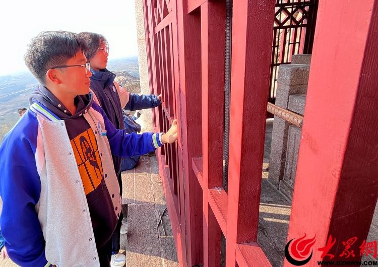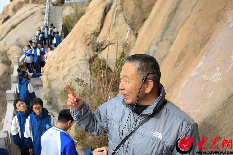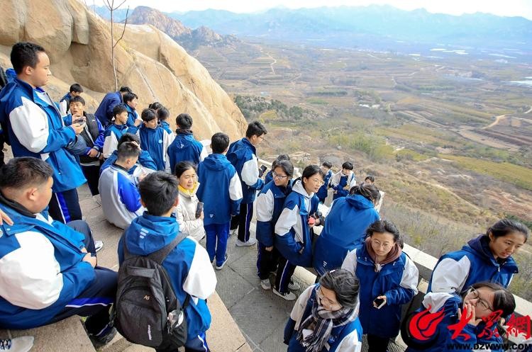 平度天柱山,位于著名的葡萄产地大泽山镇,山虽不大,但从平地拔起,似擎天玉柱,山上奇石林立,风景优美,是游玩赏景的好去处,但是真正让天柱山闻名天下的,则是精妙绝伦的北朝郑道昭父子系列摩崖石刻。在很多书法家、金石学家的眼中,天柱山已经不仅仅是一座山,它是令人向往的书法圣地。1984年,刘海粟先生曾在89岁高龄时专程登上天柱山,并题字“瑰玮博达,绝壁生辉”。同学们实地观看了天柱山摩崖石刻,进行了一场书法艺术的传承活动。在登山往返约1小时的行程中,同学们不仅体验了书法艺术的韵味,也锻炼了身体,增强了团队协作精神。