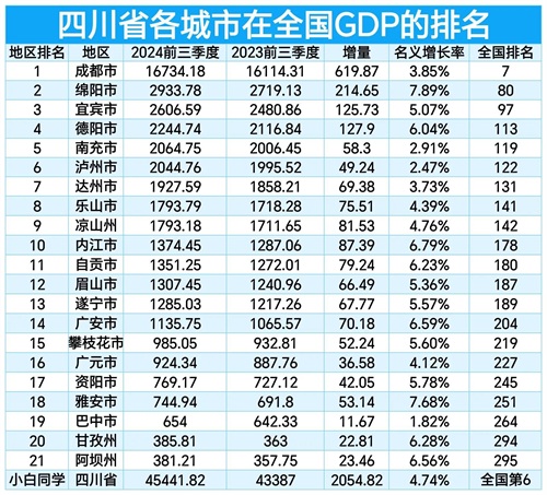 四川各城市在全国的GDP排名:成都第7,宜宾领先德阳,南充第119