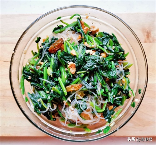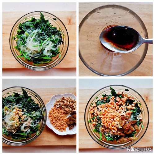 用料:菠菜、粉丝、花生仁、核桃仁、葡萄干、大蒜、盐、糖、生抽、醋、香油