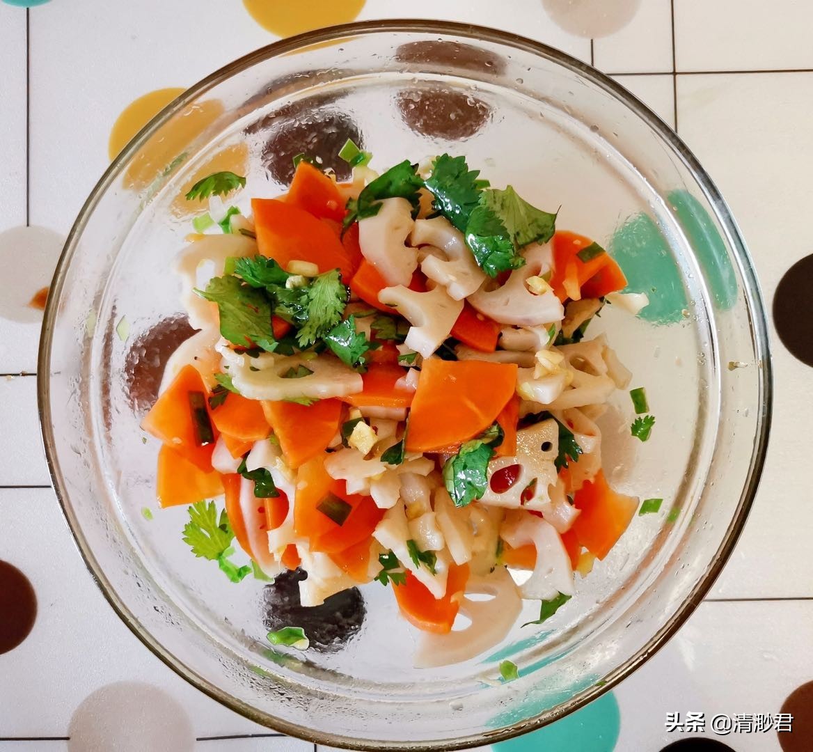 莲藕、胡萝卜切片,锅中放少许盐和食用油,将二种食材焯水,姜、蒜切末,炸点花椒油,浇在上面,激发出蒜姜的香味,撒点香菜,加盐、醋、蜂蜜搅拌均匀即可。