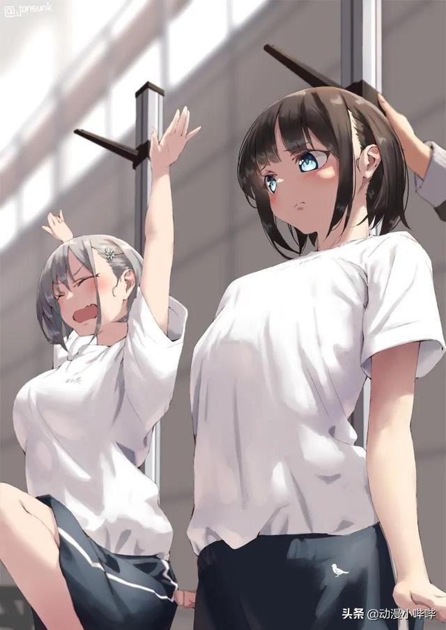 首先来看看运动前热身准备动作的JK,即便是一些简单的捶背,拉伸等动作,在画师的描绘下也变得萌呆可爱起来:身穿印着高校名字的白色T恤和蓝色短裤的白毛少女,清澈碧蓝的双瞳与额头上的蓝色小花发夹相映成辉,在阳光下透着青春的活力,还有这位褐色头发的JK,哪怕是一个简单摆手扭腰动作,都透着满满的动感,让人不仅感慨年轻真好!
