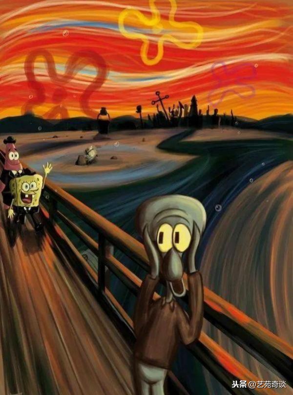 看这幅被“玩坏”后的《呐喊》,《海绵宝宝》这个动画片里的派大星、海绵宝宝以及章鱼哥都被带到画面之中,背景也变成了动画片里常见的场景。