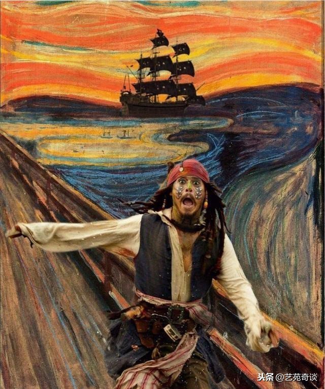 这幅作品也十分搞笑,加勒比海盗中的主角杰克船长在木桥上奔跑,他的姿态看起来十分夸张,嘴巴似乎也在呼喊些什么,远处的大海上,原先的小船已经变成杰克船长的“黑珍珠号”整个画面看起来都十分搞笑。