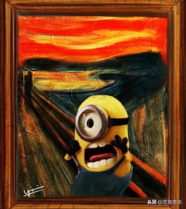 还有这幅小黄人版的《呐喊》,小黄人瞪大了它的那只大眼睛,只见它两手托腮,嘴巴张开,舌头伸出来,看起来像是受到了很大的惊吓一样,整个画面充满了可爱与搞笑的气息。