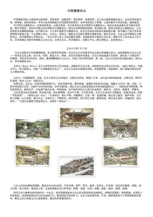 中国佛教圣地,分别供奉文殊菩萨、普贤菩萨、地藏菩萨、观音菩萨、弥勒菩萨。五大名山随着佛教的传入,自汉代开始建寺庙,修道场,延续至清末。中华人民共和国建立后受到国家的保护,并对寺院进行了修葺。已成为蜚声中外的宗教、旅游胜地。
