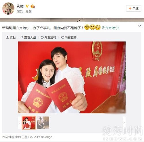 3月17日下午,沈腾在微博上晒出和女友王琦领结婚证的照片,宣布两人领证结婚,两人恋爱多年也终于修成正果。沈腾还写道:“带琦琦回齐齐哈尔,办了点事儿。刚办完就不是她了!”