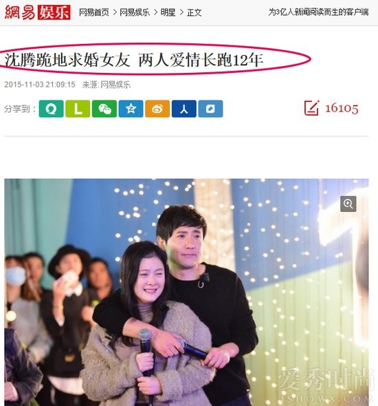 2015年11月3日晚,因开心麻花系列和主演《夏洛特烦恼》而被熟知的沈腾 ,在成都欢乐谷向女友求婚成功,结束与王琦的12年爱情长跑,成了四川女婿。沈腾在现场说道:“我说嫁给我吧,我就喜欢你的全部。”女生现场大哭,颇为感人。祝福两位!