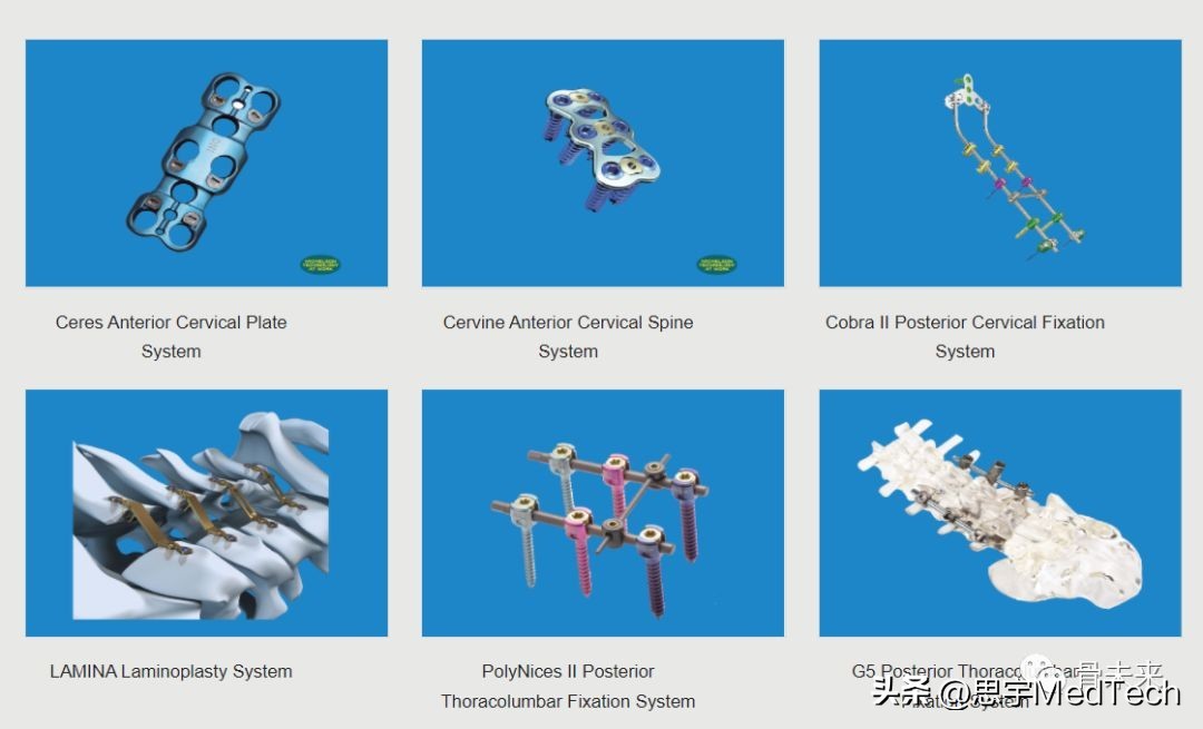 美敦力主要的脊椎治疗产品众多,包括Kyphon™气囊后凸成形术平台、Kyphon V™ Premium椎体成形术平台、Vertex®重建系统、Prestige LP颈椎间盘系统、CD HORIZON SOLERA脊柱内固定系统、CAPSTONE产品、美敦力CRESCENT产品等等。部分产品占据了脊椎市场较大份额。