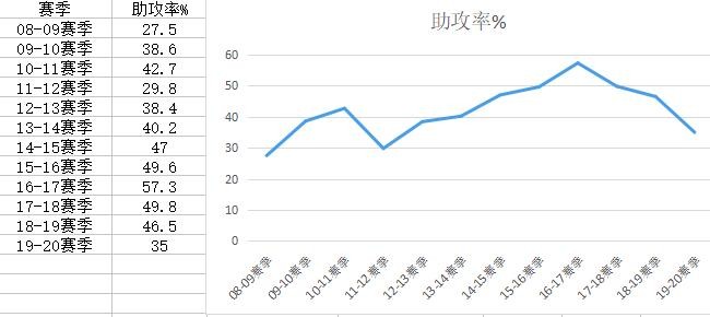 威斯布鲁克生涯至今助攻率统计