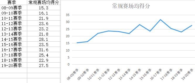 威斯布鲁克生涯至今常规赛场均得分统计