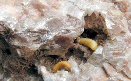 而消面虫之外,又有石中金蚕,人如果能蓄养的话,能让财富自己跑到家里来。五代徐铉《稽神录•卷一•金蚕》载:右千卫兵曹王文秉,丹阳人,其家世代善刻石。王的祖父曾经为浙西廉使裴璩(此人史书有传)开采碑石,在积石之下,得到一个自然成形的圆石头,如球状,像是人工琢磨成,重重叠叠像一层层壳包起来一样。王的祖父把石球一层层削去,最后剩下拳大那么大,再把它打破,里面有一条蚕,形状像蛴螬(金龟子的幼虫),会蠕动。大伙都不识这是什么虫,王的祖父就把它给扔了。几年后,浙西大乱,王的祖父出逃到下蜀(在江苏),有天与老乡晚上开同乡会,闲扯间谈到青蚨还钱的故事,就有人说:“人如想求得财富,莫如得到石中我蚕并畜养它,那么宝货自然而然会来。”王的祖父问他金蚕之形状,却正是他扔掉的那条虫子。
