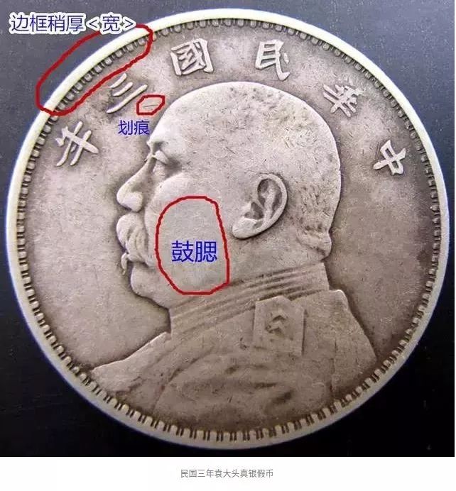 很多假银元內径圆周小于正常版,应该是用真银元作截图拓样仿制模具,为达到重量标准故用边框稍宽弥补,而袁大头像的腮部比正常版鼓(凸)些,应是试铸后的银元重量仍有偏差,在不损伤模具整体的基础上,运用凹面留银方法对模具腮部凹处进行了刮深修饰。