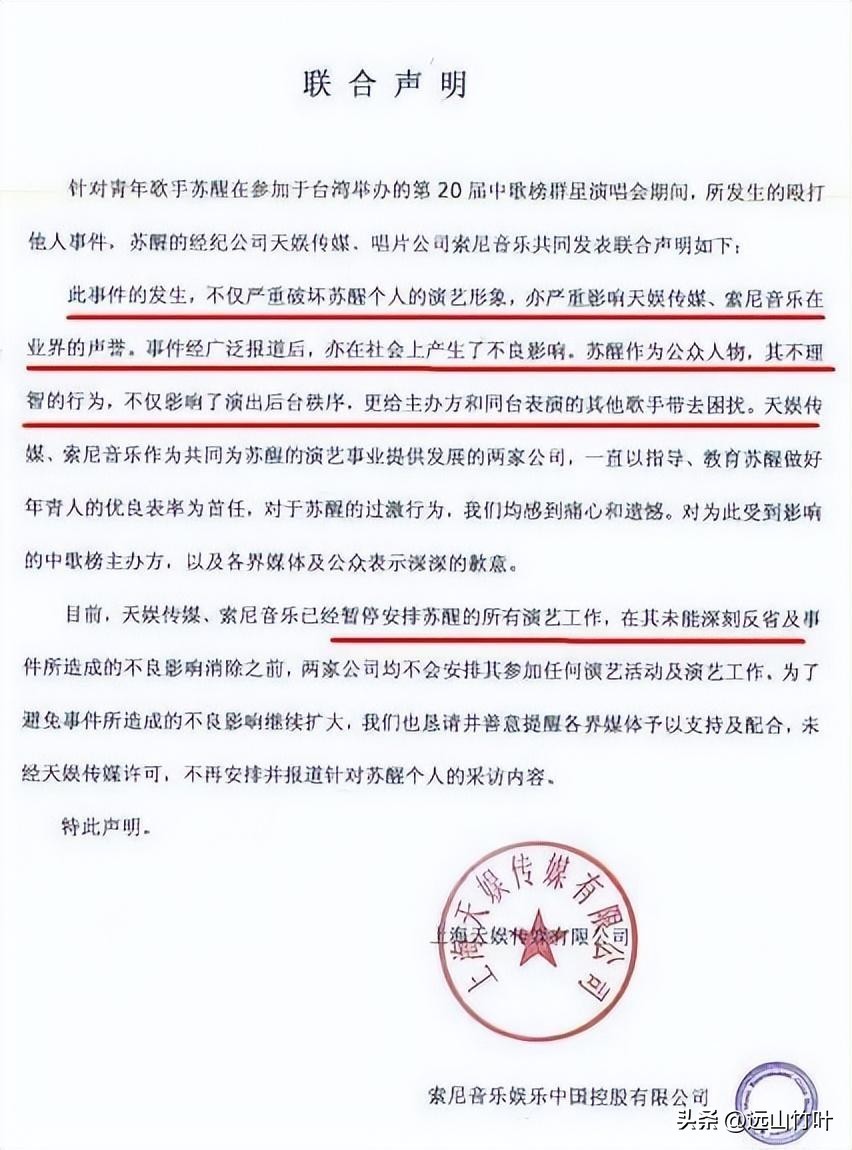 对于苏醒这一冲动的举动,经纪公司给出的处罚就是暂停了苏醒一切的工作。