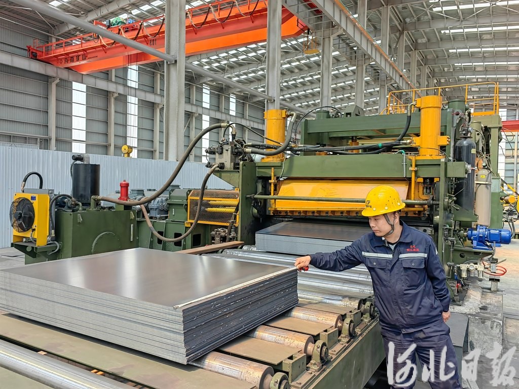 走进生产车间,全自动产线上,厚厚的大型钢板经校平后,被切割成同一尺寸的小型钢板。邯郸市槟江环保科技集团有限公司董事长刘斌介绍,他们主要加工船板、动车外壳板、太阳能支架、风电设备备件等产品,现有两条产线。