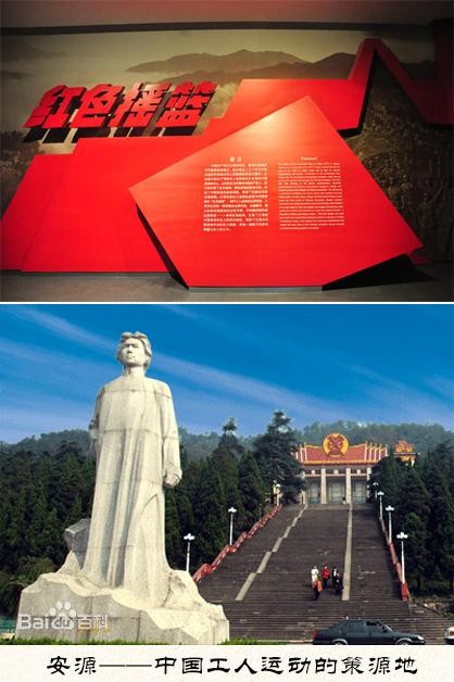 萍乡安源,现代中国工人运动的发源地。毛泽东、李立三、刘少奇于1922年9月领导发动了震惊世界的安源路矿工人大罢工,显示了中国工人阶级在中国共产党领导下团结战斗的伟大力量。1923年以后,全国工人运动转入低潮,但是,安源工人依然坚持斗争,成为当时全国工人运动“硕果仅存”的一面旗帜。1927年秋,安源工人又参加秋收起义,率先走上了武装起义和“工农武装割据”的道路,在中国工人运动史上写下光辉的篇章。