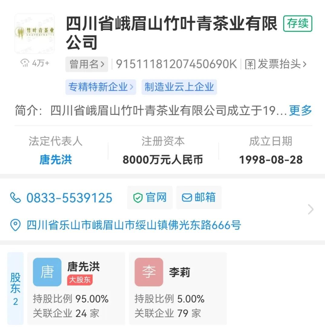 竹叶青公司全名为四川峨眉山竹叶青茶业有限公司,成立于1998年8月,股东为唐先洪,持股比例95%,注册地址为四川省乐山市峨眉山市绥山镇佛光东路666号。