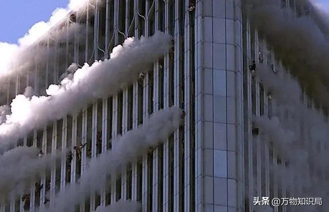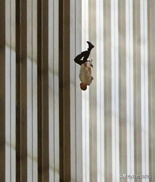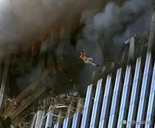 双子塔倾倒的瞬间,或许此时机组上的人员已经死亡,大楼的坍塌和爆炸,也造成了不少人员的死伤,因为火势太大加上浓烟,许多人都被困在双子塔里,其中有不少绝望的人,选择从窗户一跃而下,在抓拍到的镜头中,他们只是小小的一个影子。