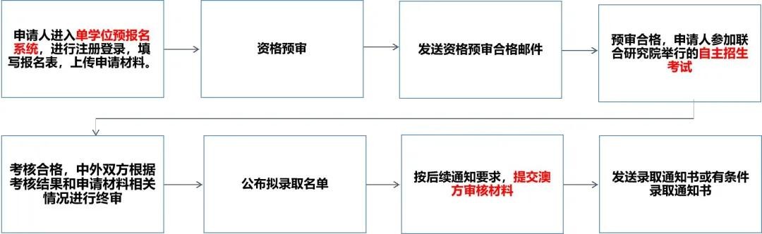 单学位项目经联合研究院及伍伦贡大学审核通过的申请人,须参加联合研究院安排的自主招生考试,考试合格获得拟录取资格后将按照以下两种方式依次录取:
