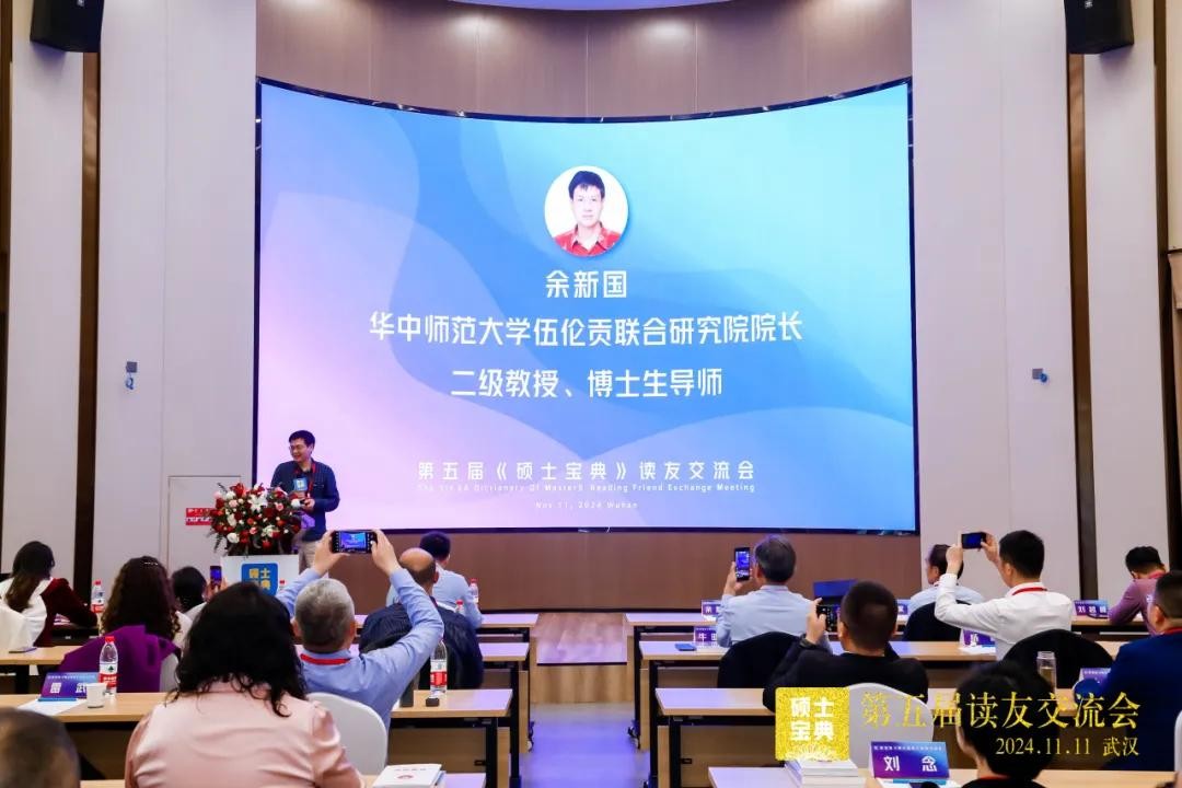 2024年11月11日,华中师范大学学术交流中心,第五届《硕士宝典》读友交流会上,华中师范大学伍伦贡联合研究院院长、二级教授、博士生导师余新国在向参会的教育同仁分享中外合作硕士办学,欢迎优质生源报考。