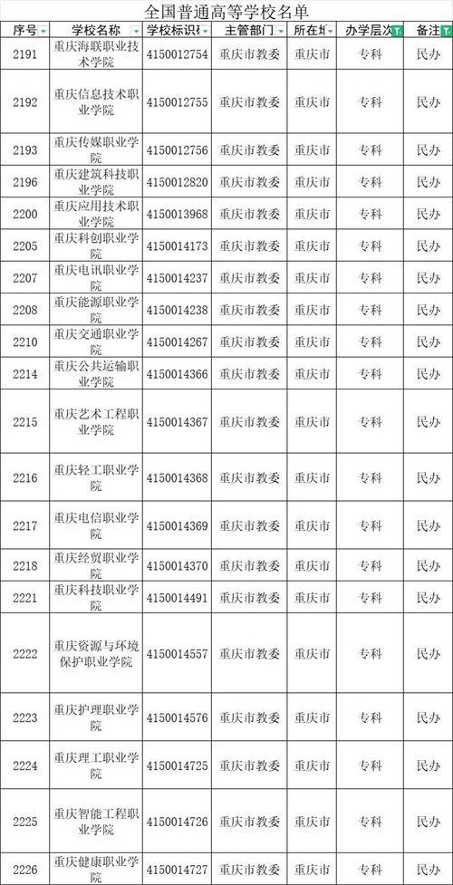 3.民办专科学校(20所):重庆的专科(含高职)院校,一共有44所,其中20所是民办高校。这20所民办高校都是重庆市教委直接管辖。