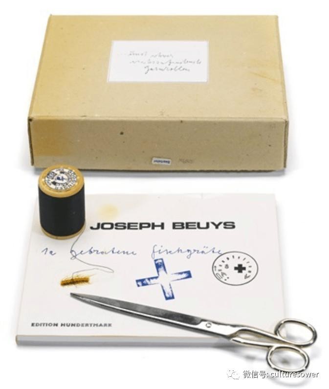 Joseph Beuys,…Und schwer Wiederfindend Garnrollen(s.445),1982。线轴、鱼骨、剪刀和书–20×26×7厘米。第33版。由Cris Contini当代提供。