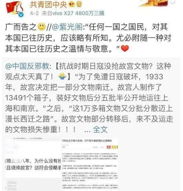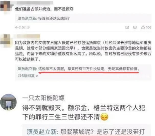 赵立新的提问引起网友的激烈反应,立马回怼:“因为故宫内的文物在日寇入侵前已经打包运抵南京。”