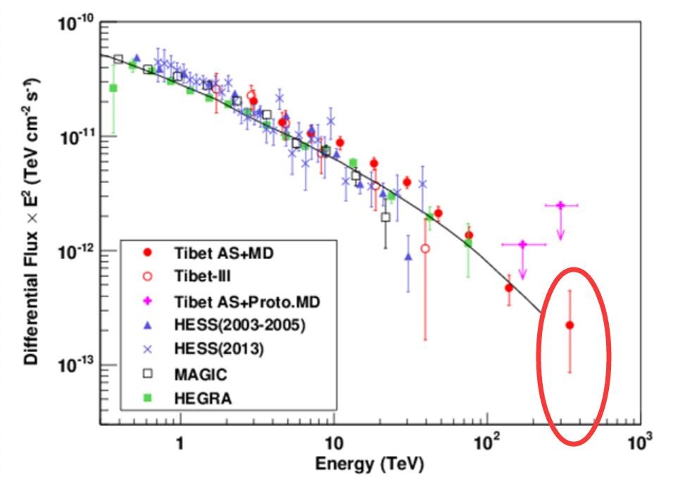 △【配图4:各国不同实验测量得到的宇宙伽玛射线能谱,红色椭圆所圈的点对应着ASγ实验测量到的450TeV超高能伽玛光子(图片来自高能物理研究所)】