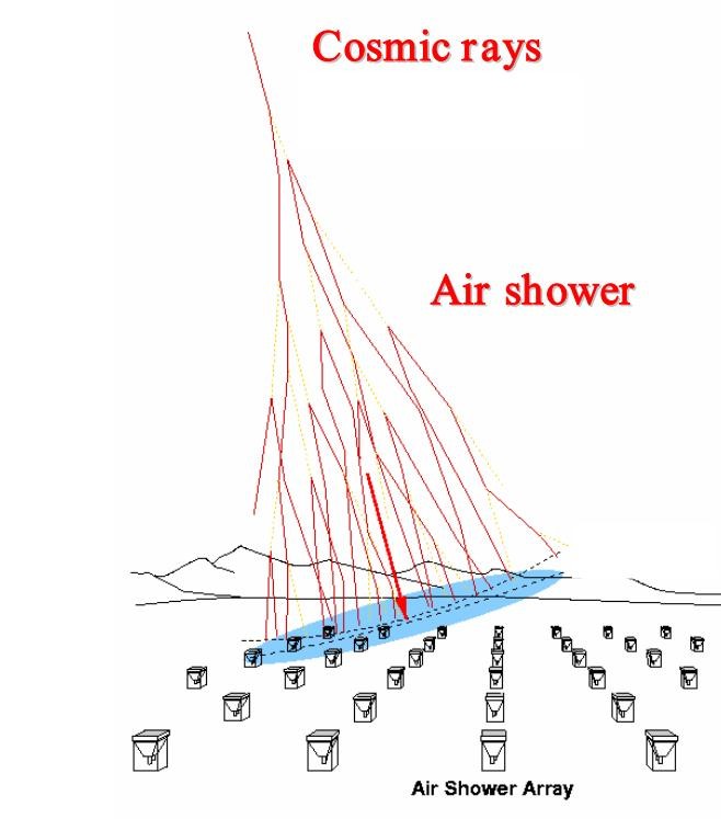 在实际实验中,人们使用的是"探测器阵列",把几十上百个小探测器按照一定几何分布排列在地面,形成一个个阵列。可以想象,这样的大型阵列往往需要建在平地上。同时,如果大气层的厚度太大,宇宙射线的簇射反而会被空气吸收,导致能探测到的粒子变少,因此,国际上许多实验的探测器阵列被安排在陆地高原上或者大山之中,例如我国的羊八井宇宙线观测站就建在西藏,有效利用了当地高海拔大气稀薄的优势。