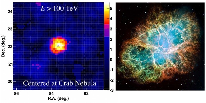 科学家仔细分析了西藏羊八井ASγ实验的伽玛射线之后,确认它们来自蟹状星云的脉冲星。蟹状星云位于金牛座,距离地球6500光年左右,是著名超新星遗迹。