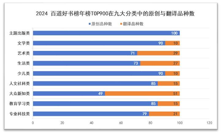 2024百道好书榜年榜TOP900在九大分类中的原创与翻译品种数(主办方供图)。