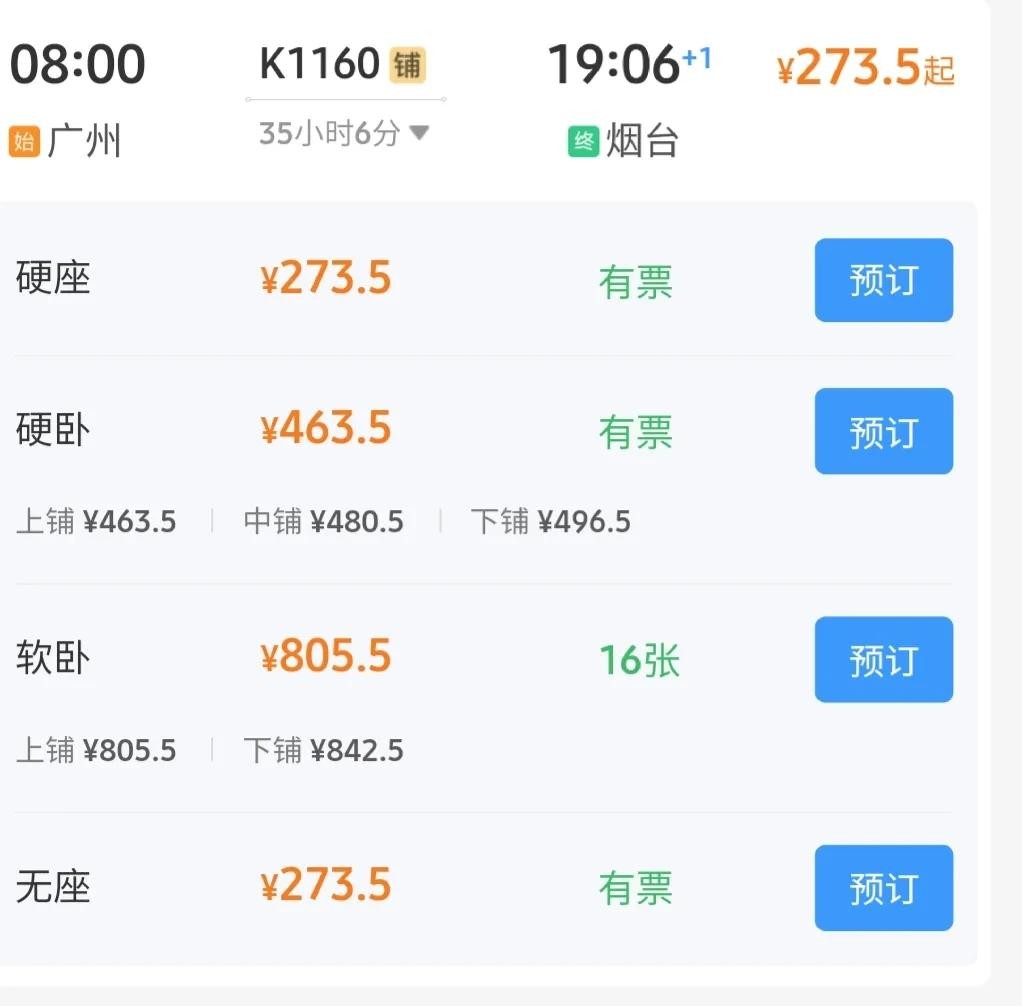 当然,你也可以选择广州其他的车站、乘坐其他的车次,前往烟台。