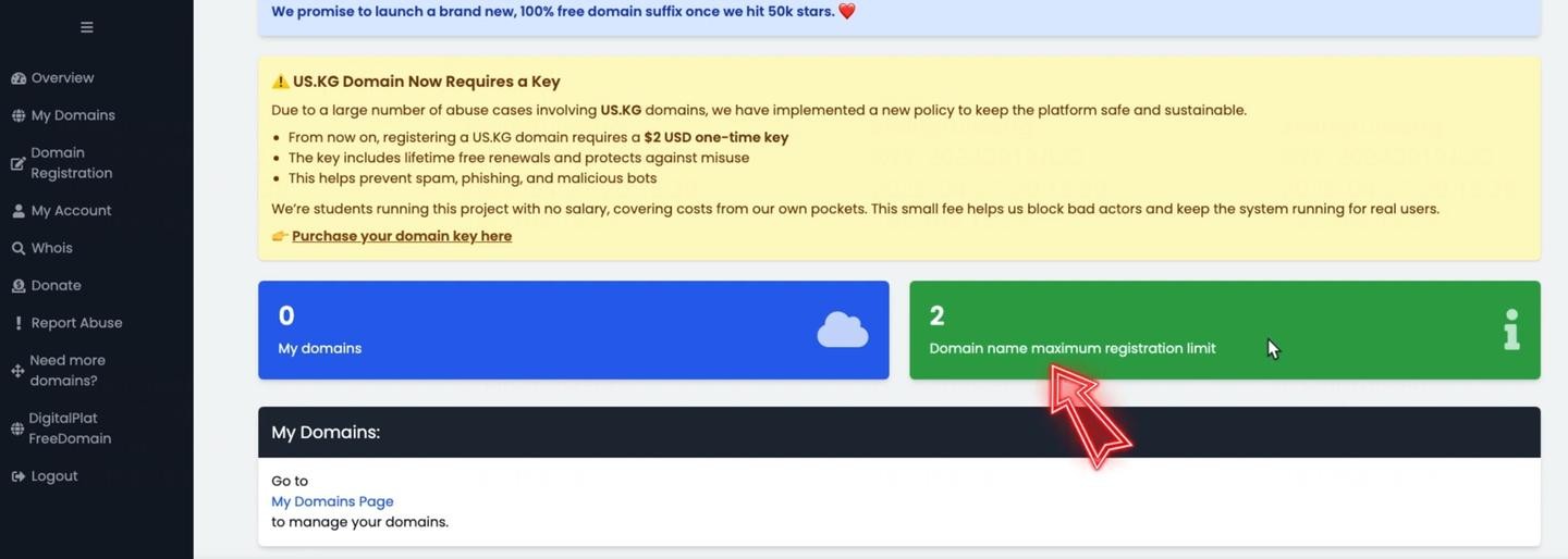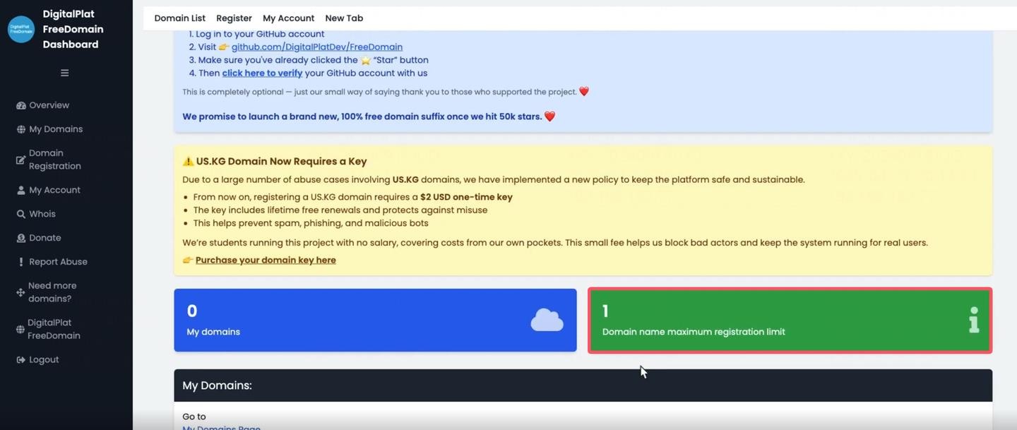 但是,这里有一个非常实用的免费福利:DigitalPlat 鼓励用户关注其开源项目。只要您给他们的 GitHub 项目点一个 Star,就能额外获得一个免费域名额度!