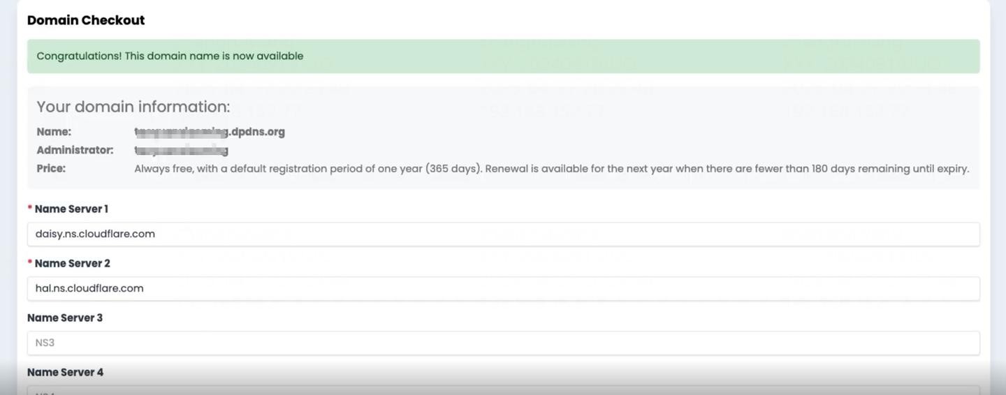 Cloudflare 扫描并确认您的域名后,会提供两个名称服务器地址。将这两个地址复制下来。回到 DigitalPlat 的注册页面,将复制的两个名称服务器地址粘贴到对应的字段中,然后点击“注册”。域名注册成功!