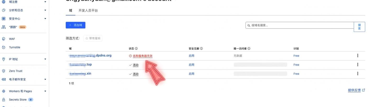 回到 Cloudflare 账户主页,您会看到刚刚添加的域名列表。域名的状态可能暂时不是“活动”(Active)。请耐心等待一段时间,直到域名状态变为“活动”,这表示 Cloudflare 已经成功识别并接管了您的域名。