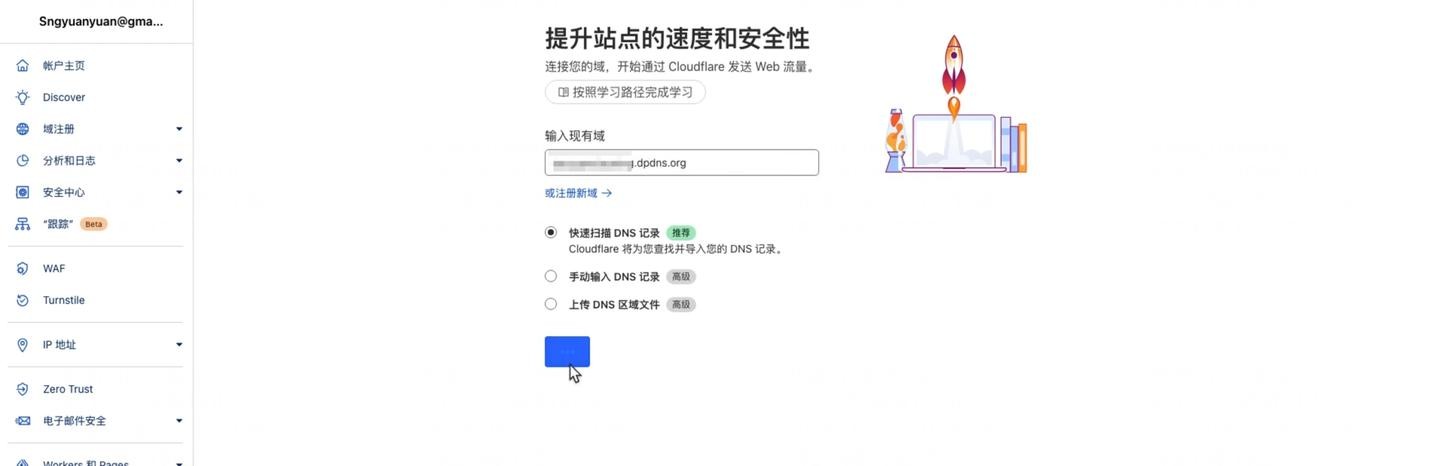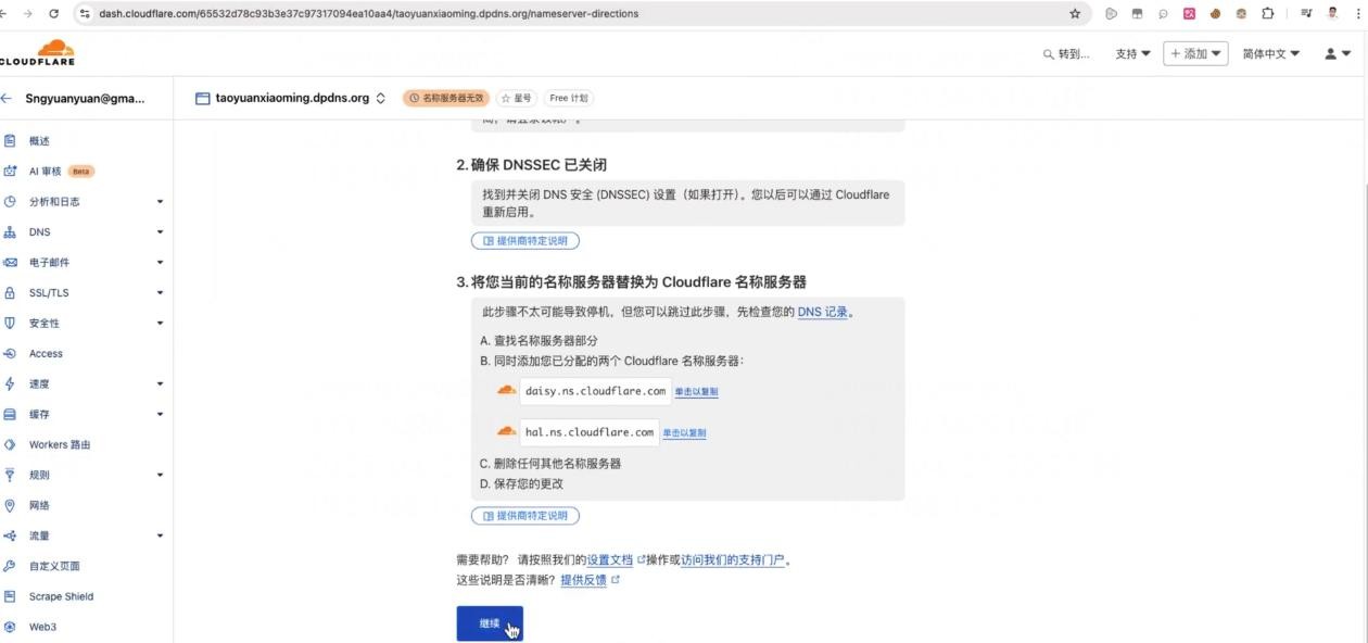 接着,需要填写两个名称服务器 (Name Server) 地址。我们将使用 Cloudflare 来托管域名的 DNS。打开 Cloudflare 网站,点击“添加域”(Add a Site),输入您的域名(例如:yourdomain.dpdns.org),点击继续。选择免费套餐,再次点击继续。