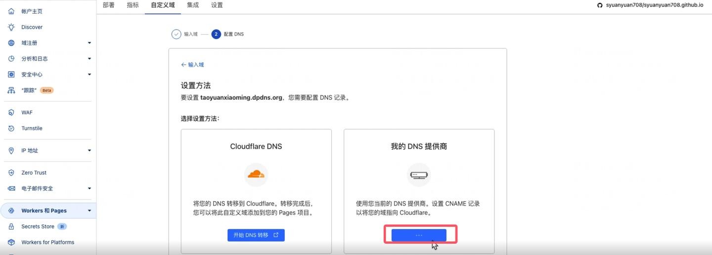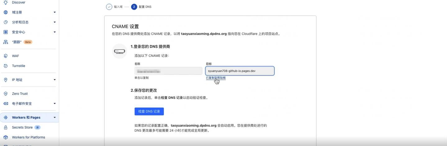 将域名托管到 Cloudflare 后,您可能需要将其设置为 Pages 或 Workers 的自定义域。这里 Pages 的设置方式与之前有所不同。